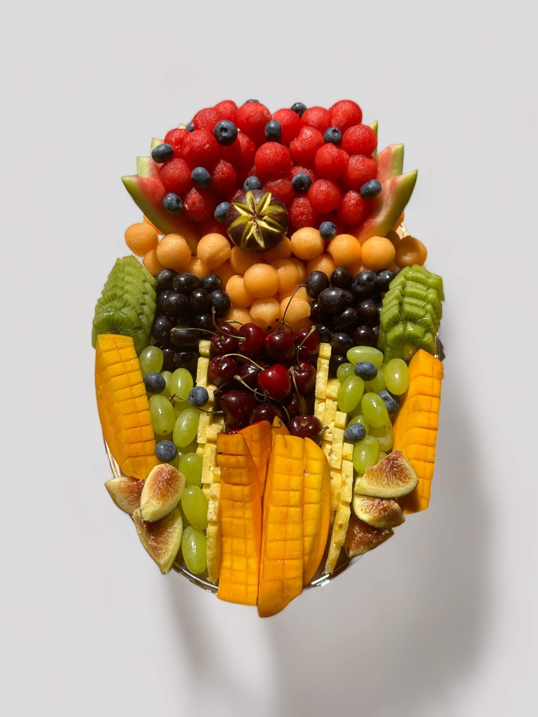 מגש פירות פרימיום אובלי משפחתי, המכיל עשרה סוגי פירות מובחרים המעוצבים בעבודת יד קפדנית.