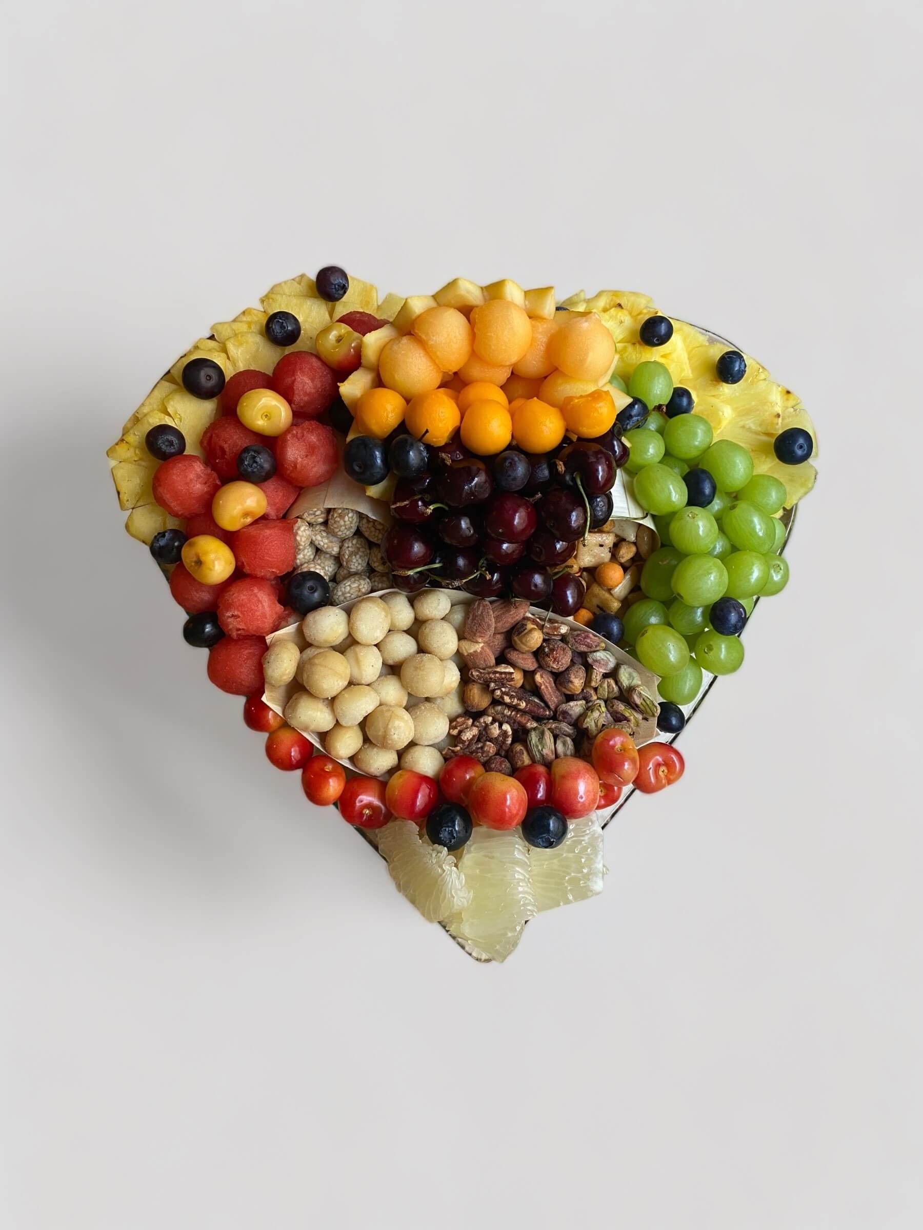 מגש פירות פרימיום ופיצוחים בצורת לב המכיל שמונה סוגי פירות מובחרים המעוצבים בעבודת יד קפדנית ופיצוחים מובחרים.